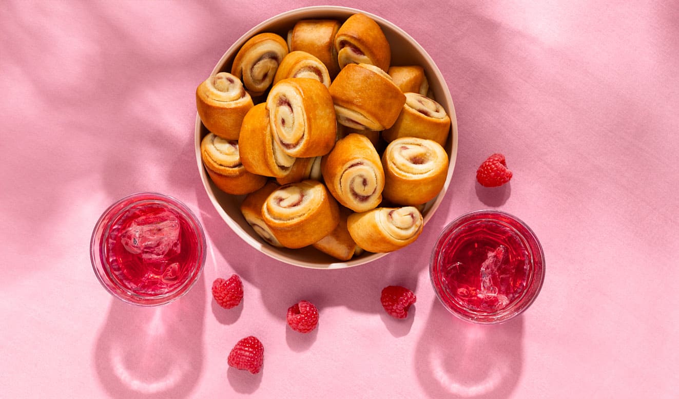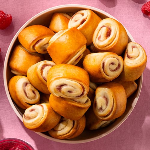 Wheat flour, water, sugar, rapeseed oil, almonds (2,5%), raspberries (2,5%), milk, skimmed milk powder, whole egg powder, blueberry juice, glucose syrup, invert sugar, barley malt, yeast, salt, citrus fibre, modified starch (potato), raising agents (E450, E500), emulsifier* (E471), acidity regulators (E330, E331), thickeners (E401, E440), preservatives (E200, E202, E282), flour treatment agent (E300), vanilla flavourings, natural raspberry flavourings, natural vanilla flavouring.