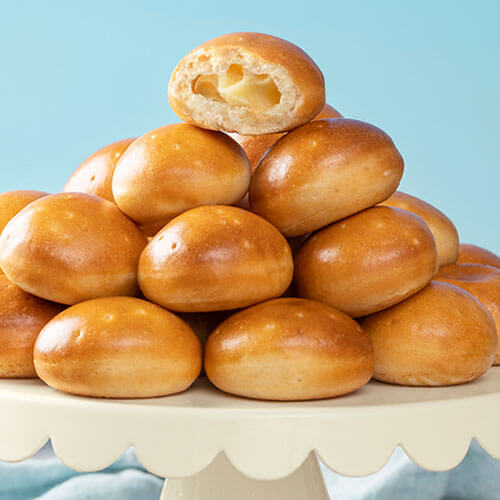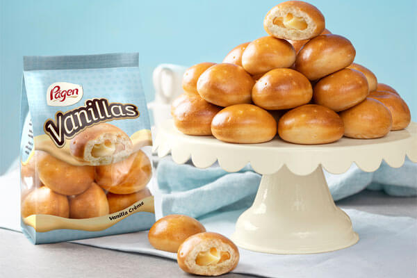 Wheat flour, water, sugar, glucose- and fructose syrup, vegetable oil (rapeseed, coconut, sunflower), skim milk powder, egg, modified starch (potato), barley malt, yeast, salt, raising agents (disodium diphosphate, sodium bicarbonate), vegetable emulsifier (mono- and diglycerides of fatty acids), acidity regulating agents (citric acid, potassium citrate), coloring agents (E170, E160a), stabilizers (E460, E466), preservatives (sorbic acid, potassium sorbate, calcium propionate), natural vanilla flavor, vanilla flavor.